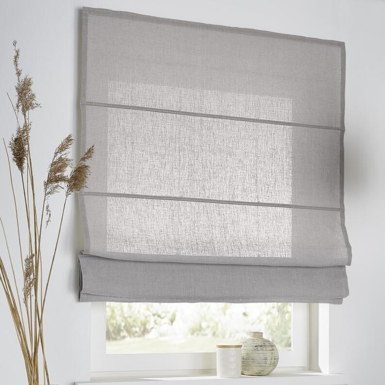 Unsere Raffrollos "Metis" in grau werden als klassische Faltrollos mit Querstäben gefertigt, die für gleichmäßige, dekorative Falten sorgen. Dank des einfarbigen Leinenstoffs in hellem grau passen sie zu vielen Wohnsituationen und Stilen. Leinenrollos sind vielseitig und schaffen ein natürliches und gemütliches Ambiente in allen Wohnräumen. Ein einfarbiges Leinenrollo passt einfach zu jedem Wohnstil.