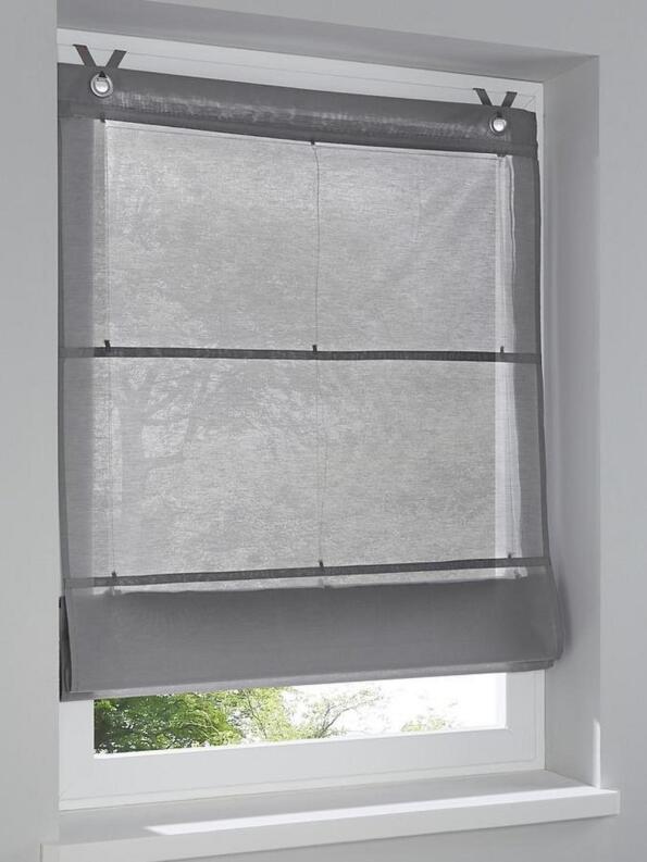 Die klare Optik fügt sich sowohl in ein klassisches wie auch modernes Wohnkonzept ein. Die Raffung erfolgt über Kordeln, welche auf der Rückseite des Raffrollos durch kleine, transparente Ringe geführt werden, so gibt es keine sichtbaren Längsnähte.