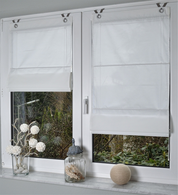 Enya weiß Raffrollos / Ösenrollos auf Maß überzeugen durch hochwertigen, festen und formstabilen Gardinen-Stoff. Sorgfältige und maßgenaue Verarbeitung unserer Gardinen und Raffrollos nach Maß garantieren optimale Passform und Bedienung.