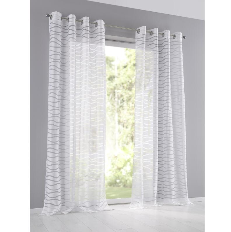 Zur Vorhang Montage an Gardinenstangen einfach silberne Metallösen aufschieben. Gardinen "Enya“ weiß mit Ösen aus weich fallendem Ausbrenner Stoff legen sich fast von selbst in schöne, gleichmäßige Falten. Für eine wohnliche und moderne Wirkung dekorieren Sie zwei Vorhänge mit Ösen jeweils links und rechts am Fenster. Auch an großen, bodentiefen Fensterfronten wirken dezent gemusterte Vorhänge ruhig und unaufdringlich.